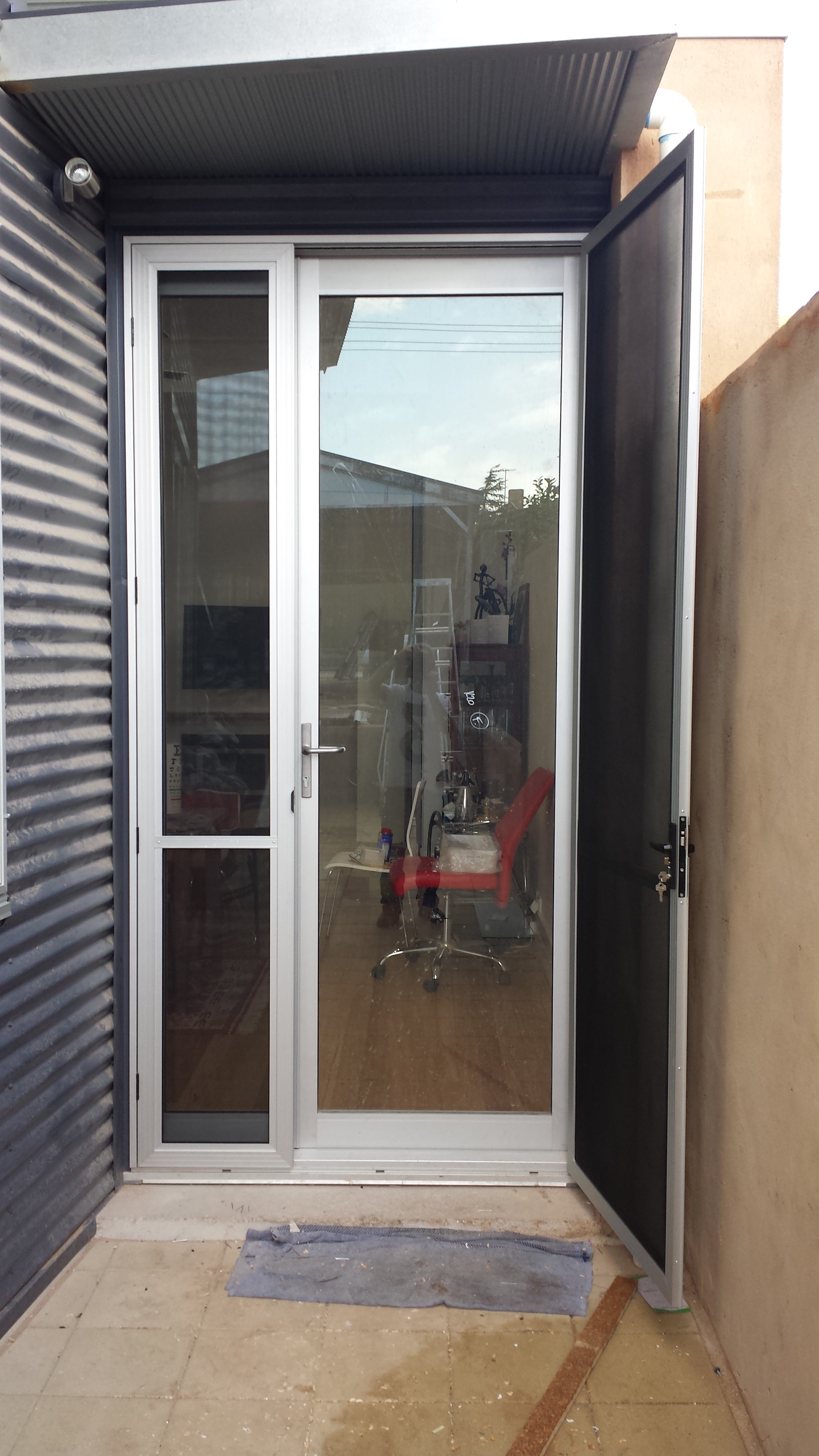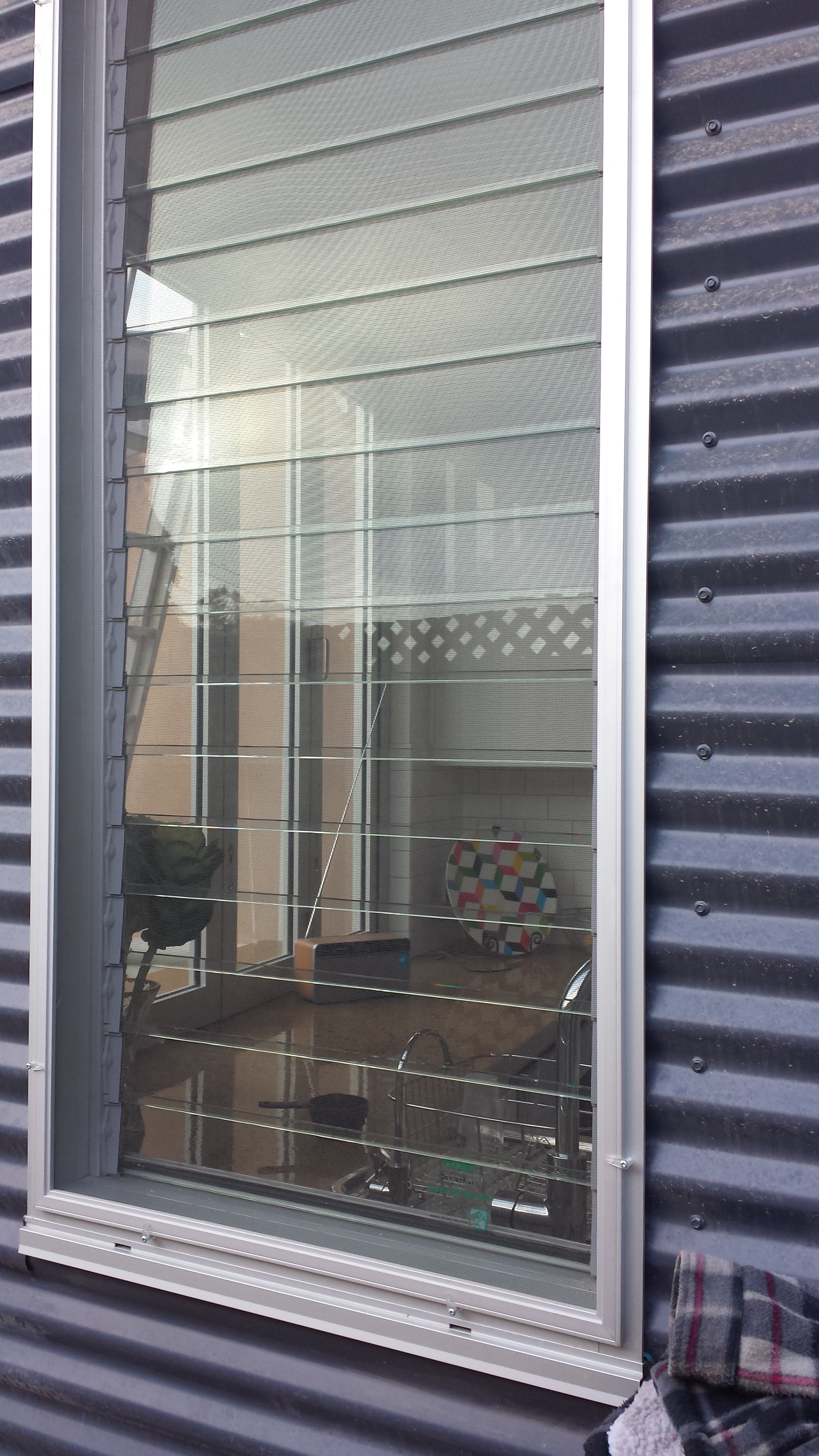 All clear/natural anodise commercial framing. The doorframe has 2 doors, one panel smaller than the other. With invisiguard security screens.  The bifold window is using CENTOR hardware and is top hung to allow for a marble servery to be used.  The doors, bifold and louvre blades are also glazed with LOW-E comfort plus glass to keep heat out.  The place looks great.
