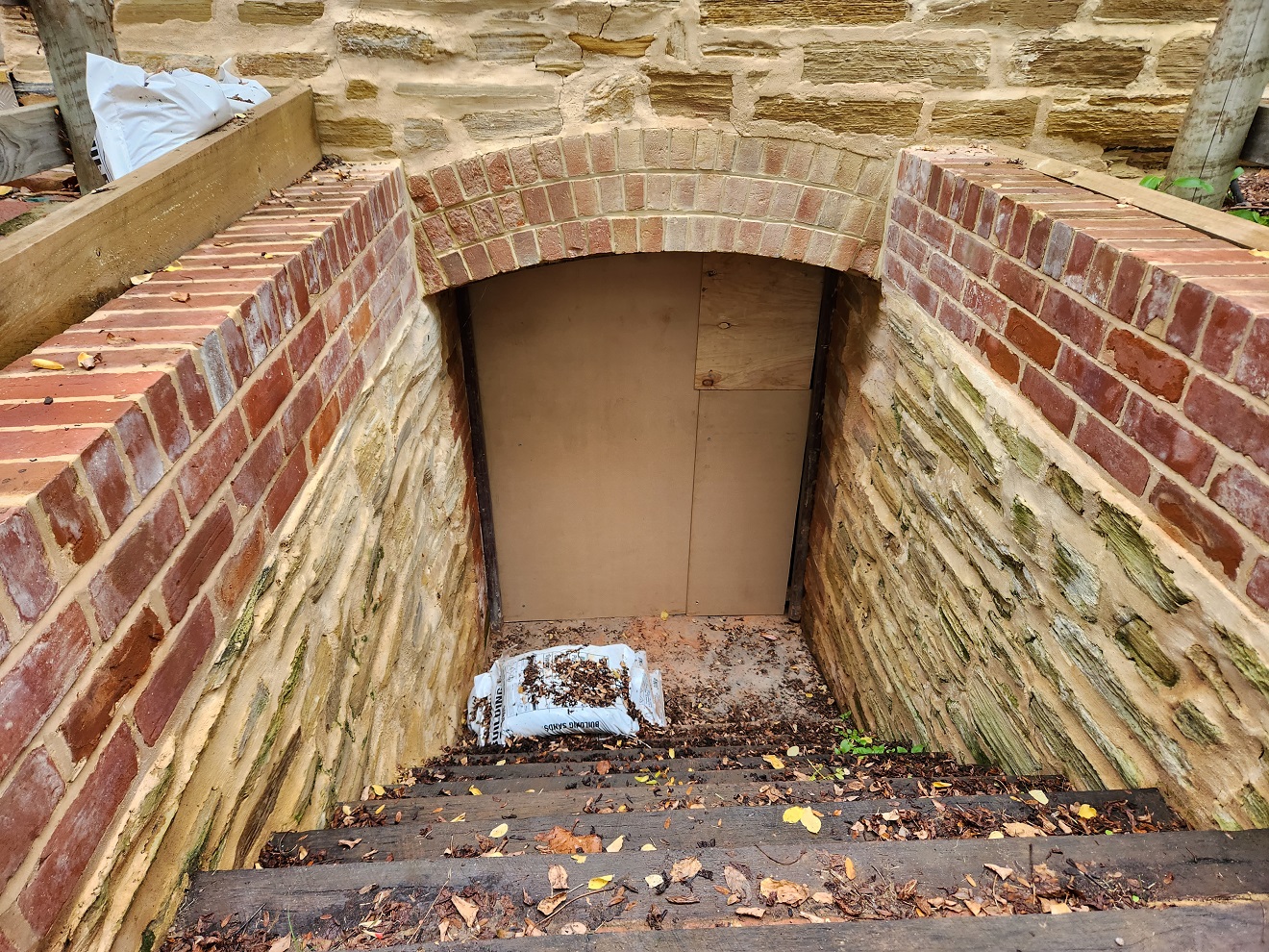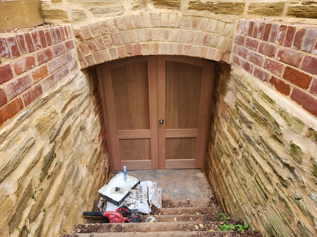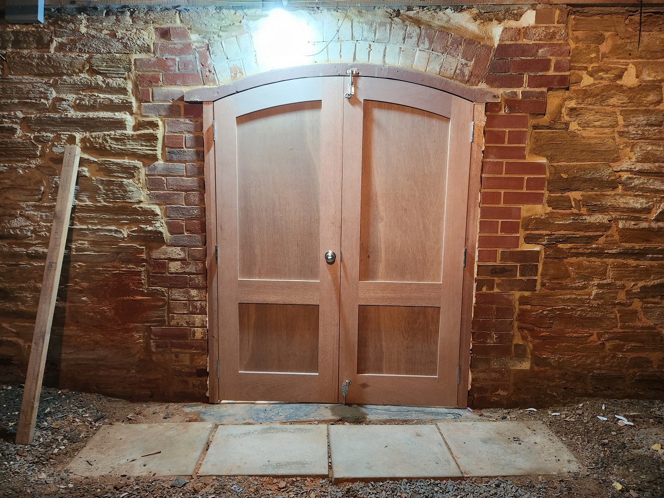 We were sent to McLaren Vale for this job. Insurance. A flash flood had swept down the cellar and destroyed the existing doors. We made new ones, and new doorframe jambs. Installed using the existing arched doorframe head, and a few tweaks on the curves on the doors we had made at our factory.
