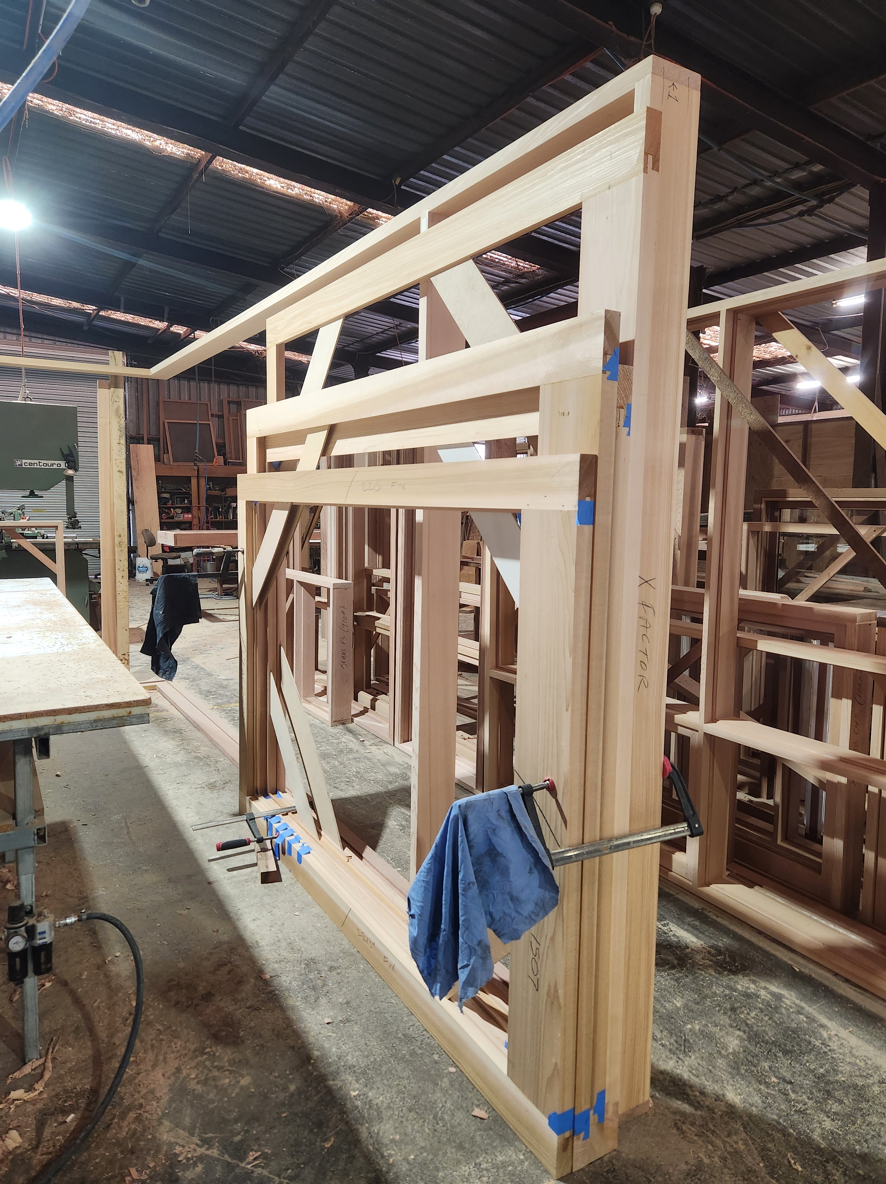 This is going to be a very technically challenging job. This is a right angle sliding door – the opening panels meet at the corner. Once fully working, this frame is going to be disassembled, and ikea-like we will “flat pack” it to the install site. We then need to bring it all inside and rebuild the frame in the room. To make it harder we will need to notch the sill and head for steel posts that will meet. To re-build the frame the fixed panels need to be screwed from underneath – so once we assemble the main frame we need to raise it high enough to get underneath the frame and fit the panels in… then fit the frame…