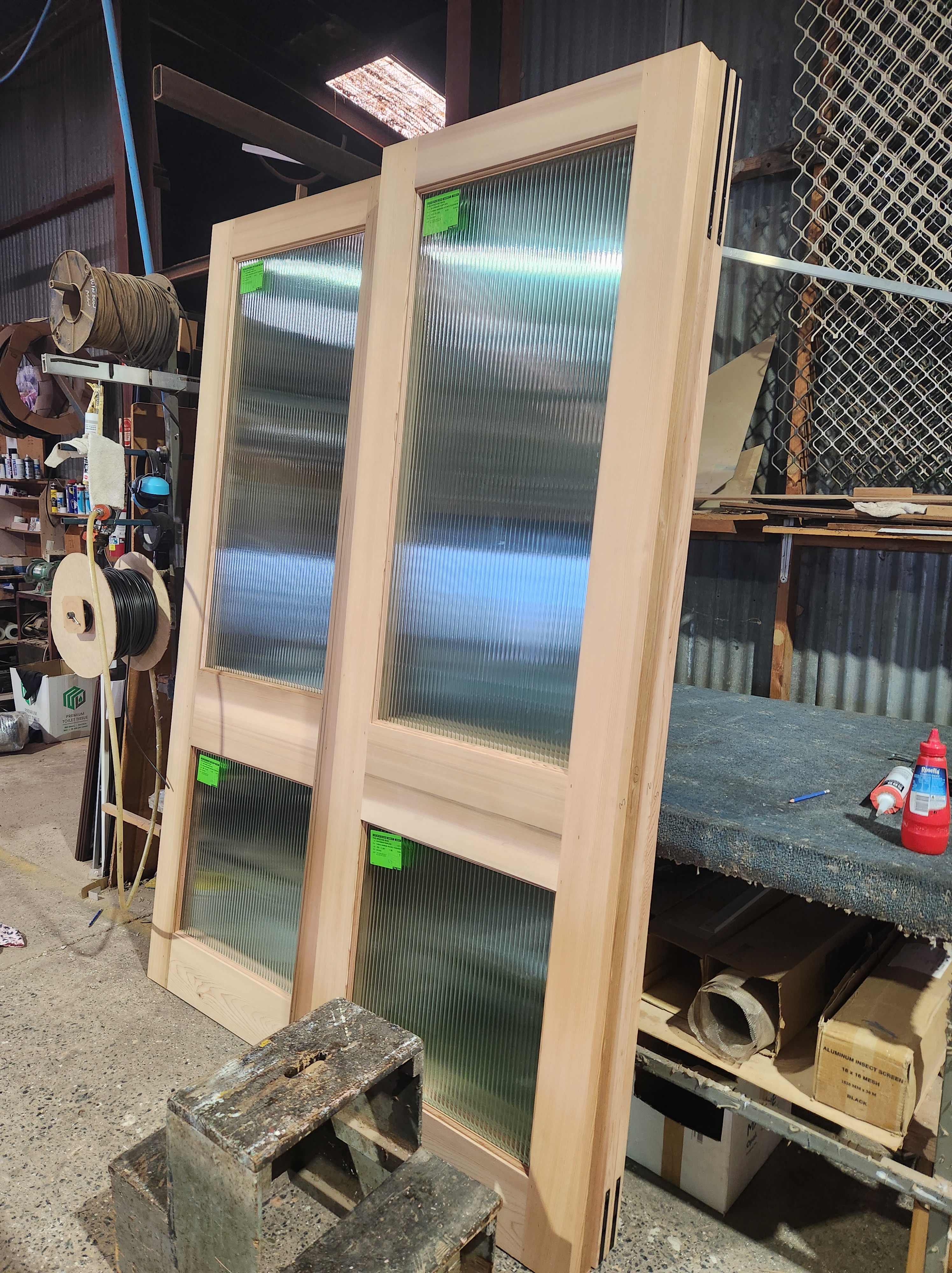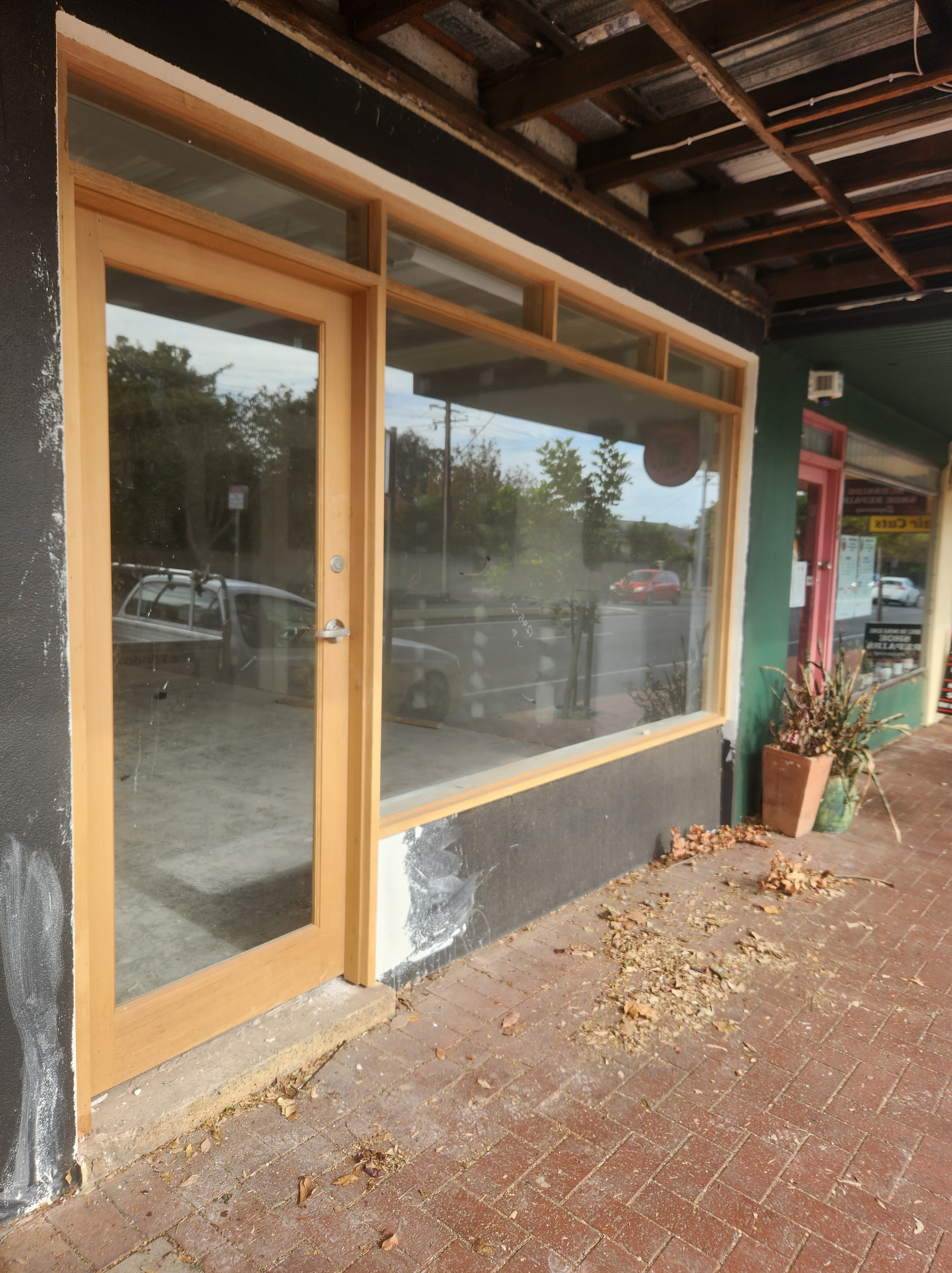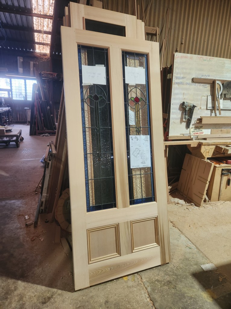 new door to suit existing leadlight the client had given us. will be a top hung sliding doordoorframe with double glazed sidelitenarrow reeded toughened glass for rebated doors and flushbolts on inactive door panelsShop front install, greenhill road. insurance job.same greenhill road insurance job.