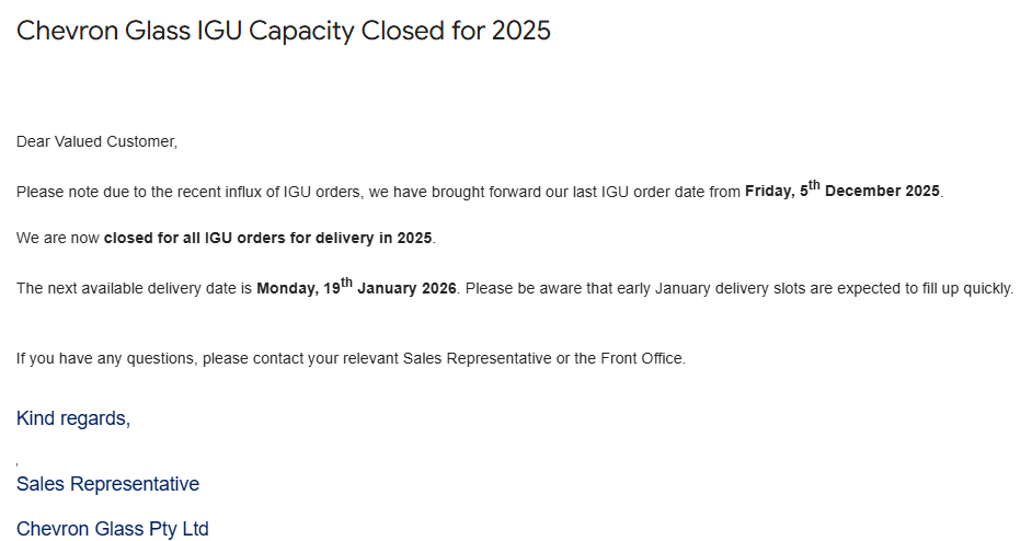 Double glazing closed for the year Uncategorized Chevron has brought forward the close of their IGU (double glazed insulated glass units) run for the year.