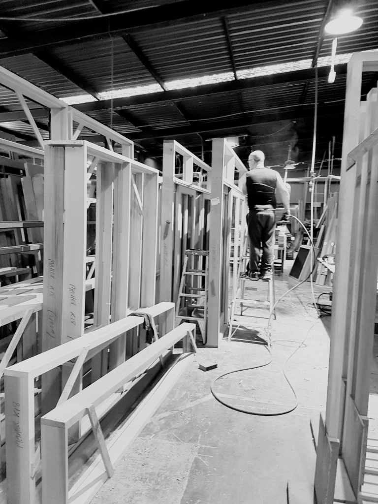 Uncategorized, Work in progressAfter a few days out on work sites installing some doorframes, and a bay window repair, I’ve come to the factory and seen the lads assembling this exceptional custom door. Just looking at it midway through assembly gives a sense of how much time and work is involved in this sort of project.