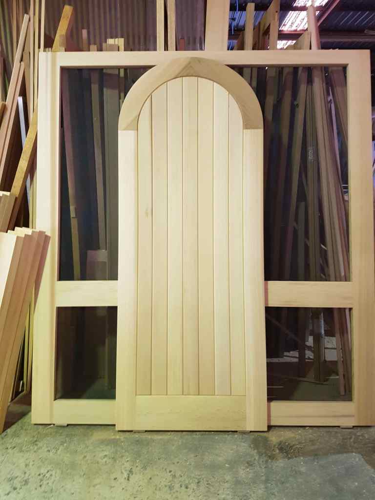 Arched solid cedar door to suit doorframe. this job also includes a frame with double doors as well.