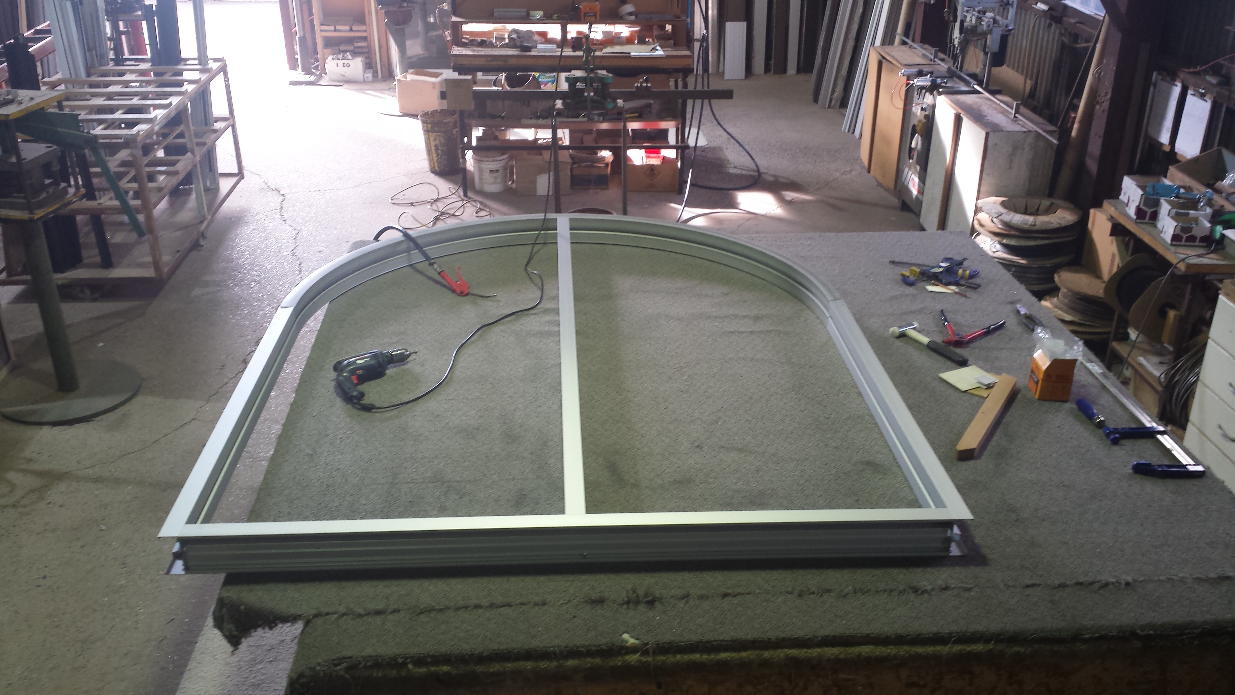 Yesterday i took this photo of a jobsite we are working on. The Client is not yet ready for the glass panels to be installed. Clear anodise commercial framing. Awnings on top of the windows.