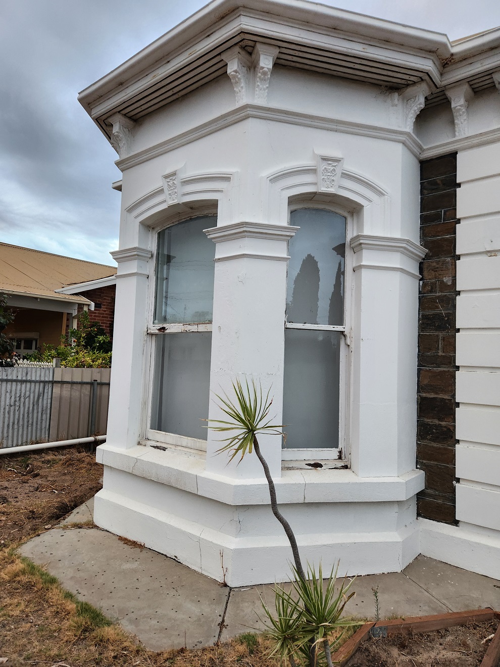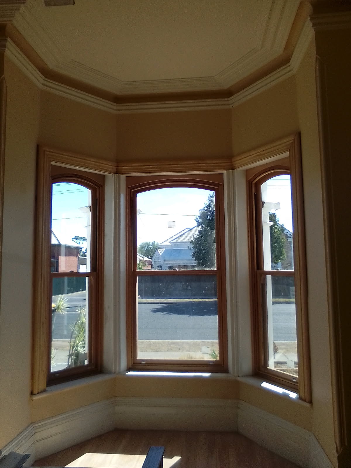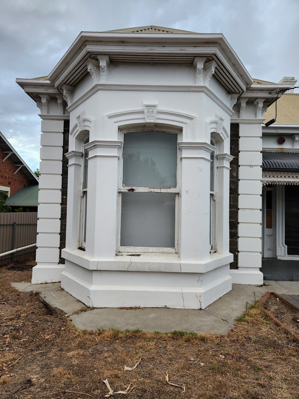 As you can see the frames are rotting out. The sashes are unable to open – wedged shut as they fall out of square and swell up as they get damp. Thin 3mm float glass. The inside bullnose sills and linings are fine, and so to keep as much of the original as possible (and to save cost) we left the inside alone. Remember nothing is square, and the client will render the outside, like it was originally.