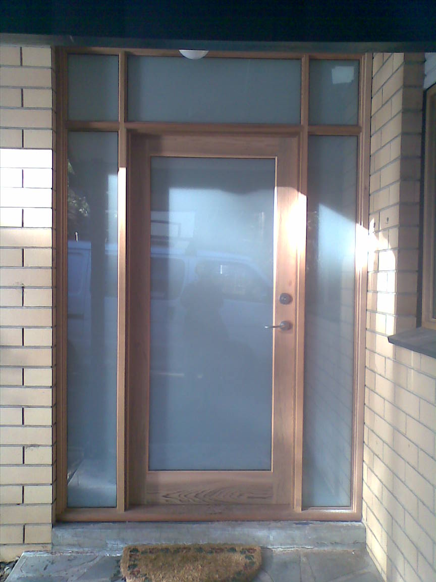 Western red cedar front door. white trans lam glass. door frame with sidelites + hardwood sill.